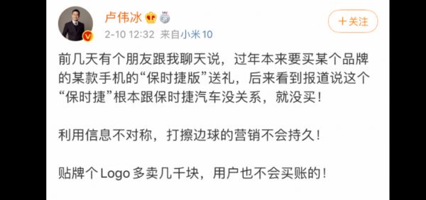 小米现任小米中国区总裁兼红米Redmi品牌总经理,卢伟冰曾在二月暗戳戳影射华为“信息不对称”,这是他形容的华为和保时捷。