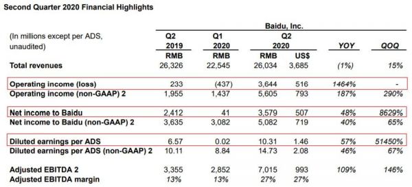 百度在昨晚美股盘后披露2020Q2业绩,营收260.34亿元,环比增长15%;经营利润重回正数,为36.44亿元,同比增长1464%;净利润为35.79亿元,同比增长48%,环比上涨8629%;稀释每股收益10.31,同比增长57%,环比暴涨51450%。