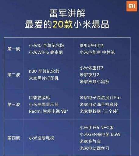 卢伟冰微博介绍,雷军此次带货商品主要为小米产品,包括小米10至尊纪念版、Redmi K30至尊纪念版、Redmi 智能电视 Max 98寸、小米透明电视等。