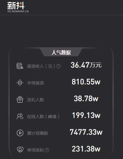据新榜旗下抖音数据产品新抖平台显示,本场直播累计7477.33万人次观看,在线人数峰值近200人次,超1.3亿次点赞。38.78万人送礼物。