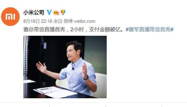 8月16日晚22时16分,“小米公司”微博发文称,雷军带货直播首秀支付金额破亿。