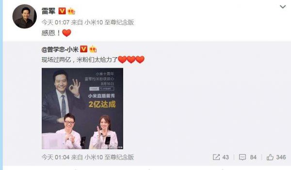 8月17日凌晨0时56分,小米直播带货销售额超2亿。1时07分,雷军转发小米集团副总裁、手机部总裁曾学忠微博,并评论道:“感恩。”