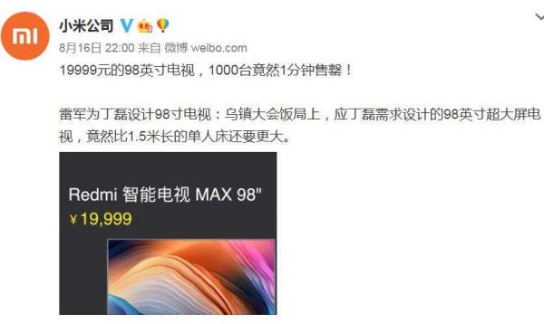 小米公司微博显示,19999元的98英寸电视,1000台1分钟内就被售罄。(中新经纬APP)