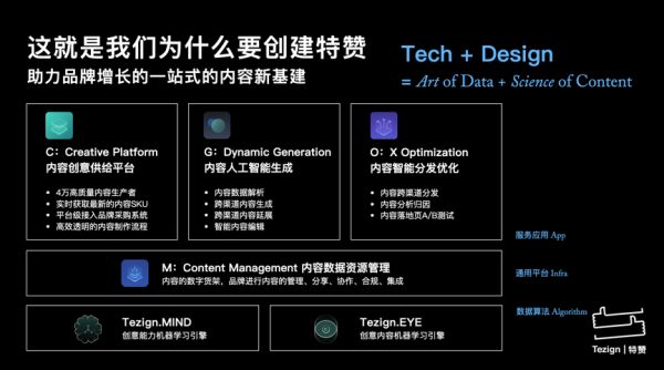 由此,特赞从最初的满足创意内容需求,逐步发展到数据资产管理、AI创意内容生成以及创意优化和分发需求,帮助企业搭建“创意内容中台”。这四项服务对应去年9月推出的“CMGO”产品体系, 36氪在去年曾有报道。