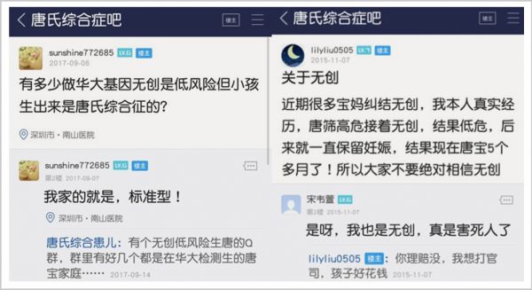 ▲无创DNA检测呈“低风险”结果、依然生下 唐氏儿的家庭在贴吧中的讨论