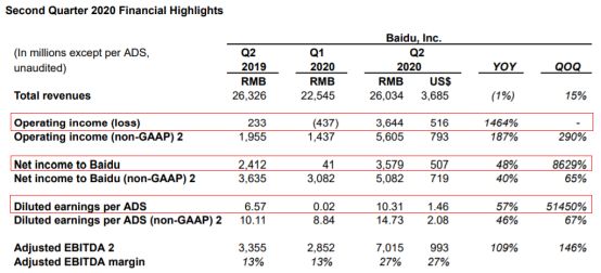8月13日晚,百度在美股盘后披露2020Q2业绩,营收260.34亿元,环比增长15%;经营利润重回正数,为36.44亿元,同比增长1464%;净利润为35.79亿元,同比增长48%,环比上涨8629%;稀释每股收益10.31,同比增长57%,环比暴涨51450%。