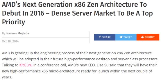2014年10月,AMD新任CEO苏姿丰在一次电话会议说到要开发zen架构,基于这个架构开发出适合服务器和桌面端是处理器,并且会在2016年推出相应产品。当时AMD股价在2.6美元附近徘徊。