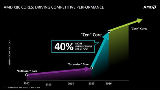 2015年5月,在纳斯达克中心举行分析师大会,CEO苏姿丰再一次提到了zen架构,并且说该架构可以将每个时钟周期指令集提高40%。40%意味着什么?从下图可以看出,这让处理器性能上了一个大台阶。
