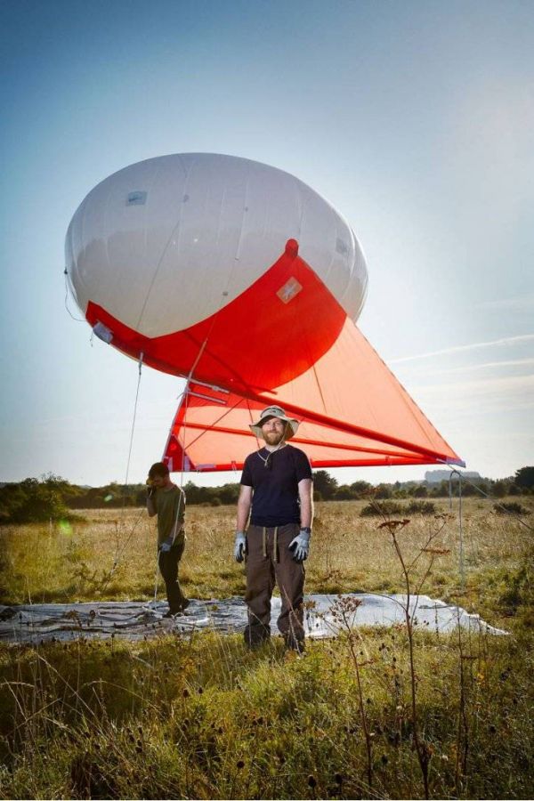 克里斯·哈索(Chris Hassall)拉紧绳子,让氦风筝缓缓下降。2019年8月,他带领着利兹大学的一个研究小组,使用一对小汽车那么大的氦风筝在英格兰南部两个地点对空气进行取样。