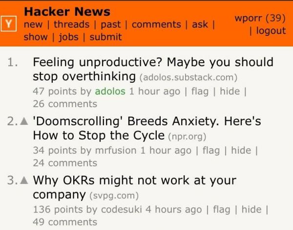 Porr第一篇博客文章,也是登顶Hacker News最受欢迎文章榜首文章标题为《感觉效率不高?也许你应该停止过度思考(Feeling unproductive? Maybe you should stop overthinking)》。