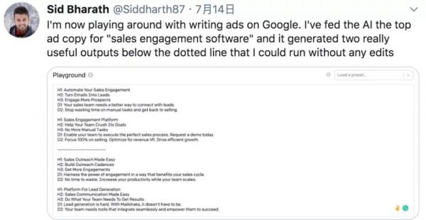 文摘菌看了一下,有用GPT-3做数据分析的,比如根据描述创建图表;有做逻辑推理的,比如让GPT-3做数学题;还有一些比较常规的文本生成项目,比如可以让AI帮你想Google的广告词: