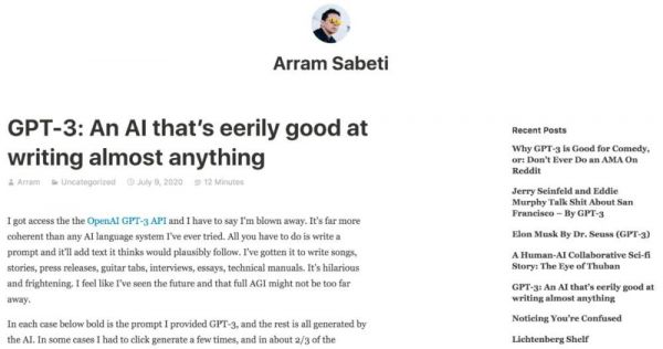 Sabeti博客链接:https://arr.am/2020/07/09/gpt-3-an-ai-thats-eerily-good-at-writing-almost-anything/
