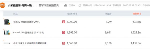 根据蝉妈妈数据显示,本次直播销售额TOP3分别为,小米10至尊纪念版5G手机,销售额6430万;Redmi K30至尊纪念版5G手机,销售额超2172万;米家大1.5p变频智能空调,销售额超1400万。