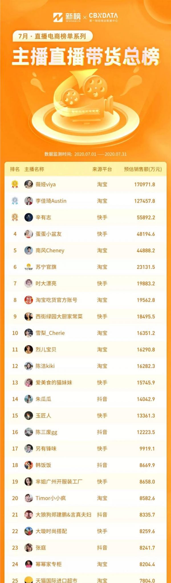 如果是单纯为了带货,或许雷军不会选择抖音平台。根据新榜7月主播带货总榜,前十名主播不见抖音平台的身影。