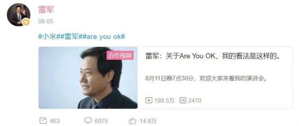 B站镇站之宝、鬼畜单曲《Are You OK》就剪辑自雷军发布会。此次为配合入驻B站,他又邀请当年操刀《Are You OK》的UP主再次剪了一支鬼畜单曲。截止8月17日,此条视频在B站的播放量已达到199.5万,仅次于雷军官宣入驻。