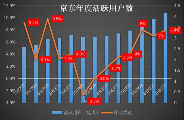 昨日晚间,京东发布了在香港二次上市后的首份财务业绩,报告显示,本季度京东净收入2011亿元,首次实现单季净收入破2000亿元,同比增长33.8%,增速在两年后重返30%以上。其中商品销售净收入为1782亿元,同比增长33.5%;服务净收入为229亿元,同比增长36.4%;值得注意的是,日用百货商品销售净收入达640亿元,同比增长45.4%,增速均高于京东净收入的整体增速。截至2020年6月30日,京东过去12个月的活跃购买用户数达4.174亿,同比增长29.9%,环比增长7.9%,单季度新增3000万。