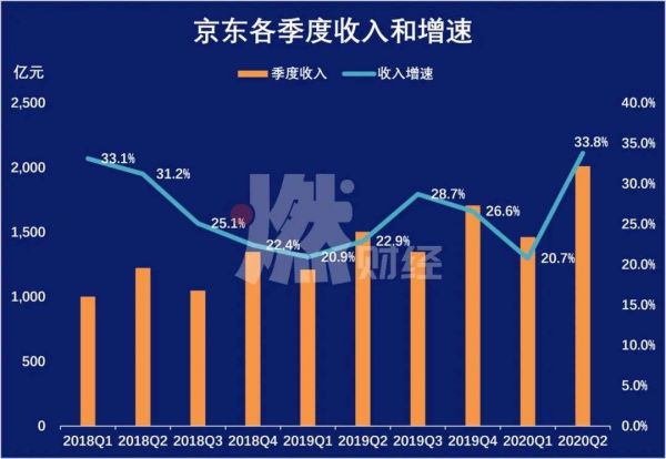 二季度,京东实现收入2011亿元,同比增速是33.8%。这个数据有两层意义,一是历史上首次单季度营收过2000亿元,二是在2018年三季度增速降至30%以下近两年后,营收增速再次超过30%。