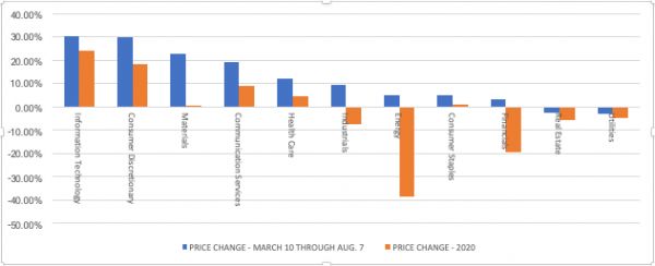 分板块来看,科技股强势占据了疫情期间的C位。在标普500的11个主要板块中,信息技术板块表现最好,整体上涨了30.2%,紧随其后的是电商消费板块,上涨30%。而金融、房地产、公共事业等传统相关板块跌幅较大。
