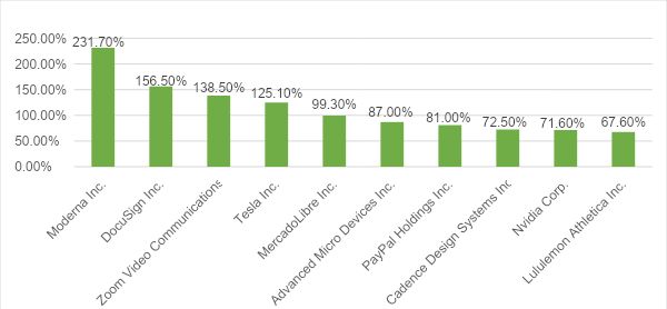 从个体公司来看,疫苗公司Moderna增幅高达231.7%,位居第一,其次是电子签名公司Docusign,紧随其后的则是疫情期间的大热门Zoom以及特斯拉,位列第五的则是阿根廷电商公司美客多(MercadoLibre)。而在这排名前10 的科技公司中,除了Moderna、美客多以及LuLulemon总部不在硅谷之外,其余均为硅谷公司。