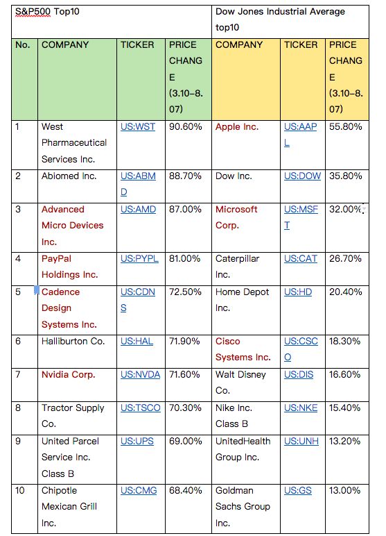 图 疫情期间标普500与道琼斯指数成分股中增长排名前10 的公司,硅谷洞察根据公开数据整理