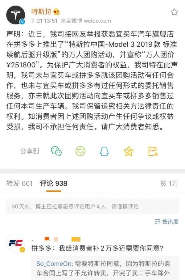 18天前,拼多多宣布用25万就可以买27.1万的Model3标准续航升级版,特斯拉马上强硬表态,声明未与宜买车或拼多多就该团购有任何合作,也没有任何形式的委托销售服务。