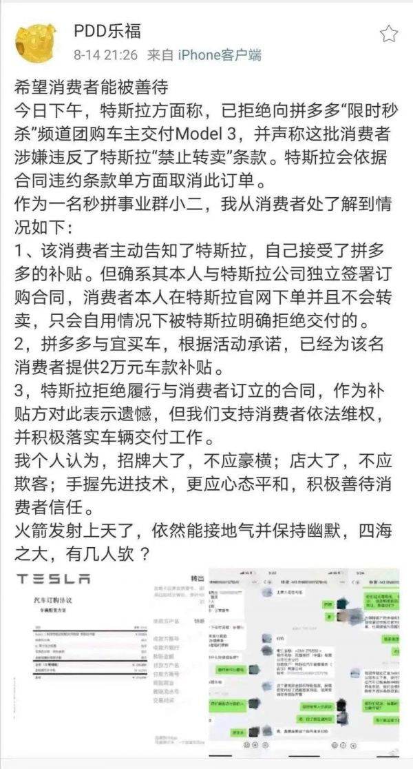 此次,特斯拉并没有获得授权拼多多去做补贴销售,没有和特斯拉达成销售协议,出现了转卖纠纷。