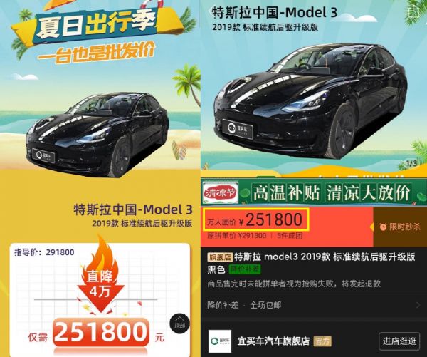 拼多多和特斯拉的这次“合作”始于一个月前。7月21日,拼多多联合“宜买车”店铺推出了一场特斯拉万人团购活动。虽然只有5个名额,但因为价格比特斯拉官网优惠好几万,吸引了很多人的关注。