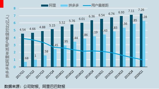 截至2020Q1,拼多多的年活跃用户数达到6.28亿人,与阿里的差距首次缩小至1亿以下。2019Q2后年活跃用户数依然高速增长的原因在于百亿补贴的推出。