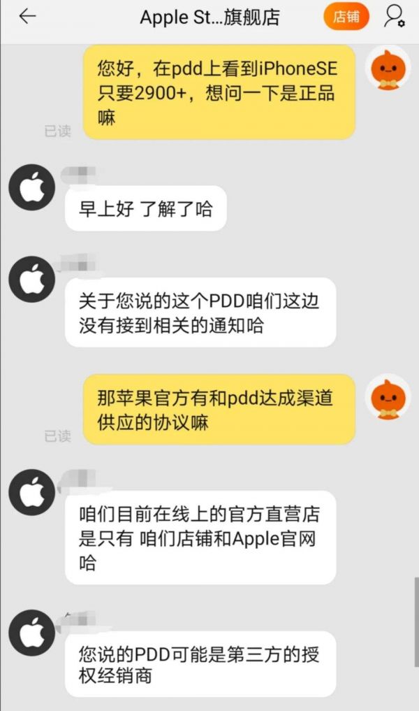比如苹果,实际上,截止到今天,苹果官方并没有入驻拼多多,我们今天上午再次去苹果询问,依然得到了如下的回复。