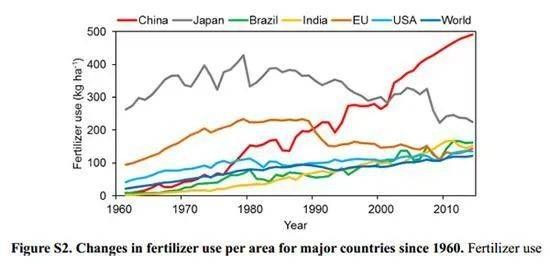 图:中国(红)、日本(灰)、巴西(绿)、印度(黄)、欧盟(橙)、美国(浅蓝)、世界平均(深蓝)单位面积化肥施用量自1960 年来的变化曲线
