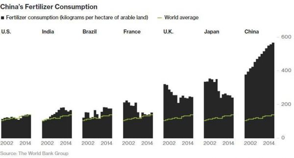 图:中国、美国、法国等国化肥施用量,来源:彭博社
