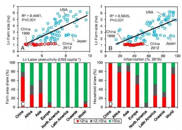 图:各国农场规模、耕地面积、劳动生产力及城市化,来源:谷保静团队[4]
