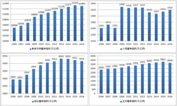 2008年之前,小麦种植面积低于2400万公顷。2008年全球粮食涨价,中国加大了小麦的播种。从2009年开始,小麦播种面积均超过2400万公顷。稻谷和玉米的播种面积也是从2008开始增加,稻谷到2011年稳定在3000万公顷以上,玉米到2012年稳定在3500万公顷。