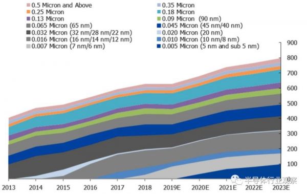 Gartner指出,2019年晶圆代工市场,收入贡献最大的为 0.016micron(12/14/16nm),达到 97 亿 美元;其次为 0.032micron(22/28/32nm),达到86亿美元。10nm 预计 26 亿美元, 7nm 预计85 亿美元。不难发现,先进制程在未来将会呈现出越来越高的比重。