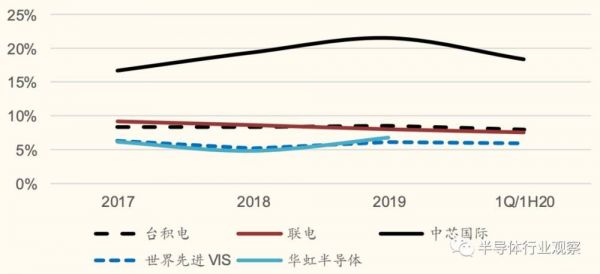 值得注意的是,中芯国际从2017年的16.72%,增加到2019年的21.55%,其研发费用占营收比超过两倍于台积电/联电的8-9%及世界先进/华虹的6-7%。这足以看出他们对未来的野望。