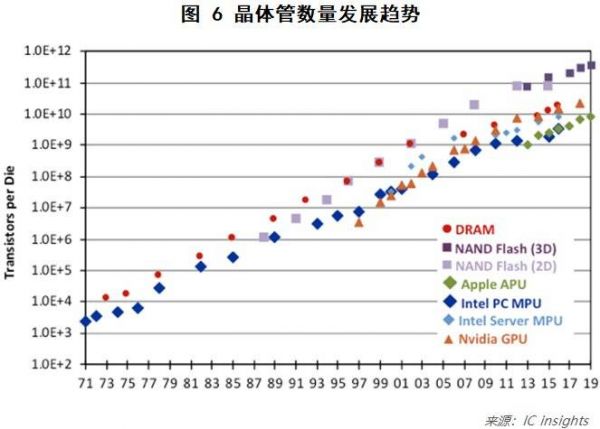 不过,值得注意的是,摩尔定律在计算芯片领域依然维持,很大原因是因为图形处理器(GPU)的迅速发展,弥补了通用处理器(CPU)发展的趋缓,如图6所示,从图中可以看出GPU的晶体管数量增长已超过CPU,CPU晶体管开始落后于摩尔定律。