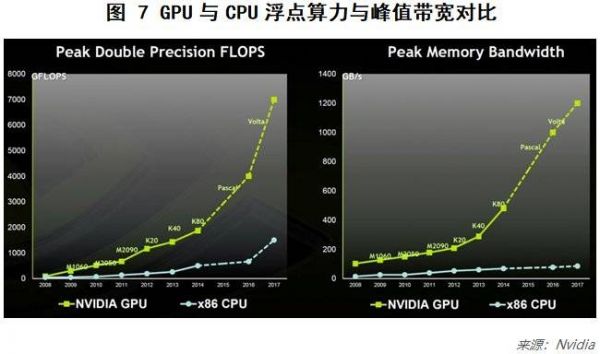 当然,半导体晶体管数量反映整体趋势可以,但还不够准确地反映算力发展情况。对于AI系统来说,浮点运算和内存是更直接的算力指标,下面具体对比一下GPU和CPU这2方面的性能,如图7所示。可以看出,GPU无论是在计算能力还是在内存访问速度上,近10年发展远超CPU,很好的填补了CPU的性能发展瓶颈问题。
