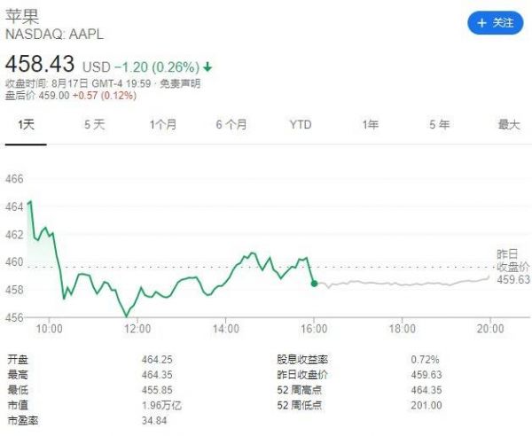 受到Epic事件影响,苹果在美东时间8月17日收盘时股价下挫0.26%,报458.43美元。