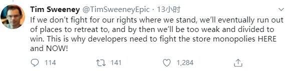 8月17日,Sweeney在社交媒体上发声,“如果我们不为自己的权利而战,我们最终将会无处可退……这就是为什么开发商此时此刻需要反击苹果商店的垄断。”
