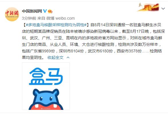 深圳盒马鲜生21家超市全员经检测 未发现新增阳性病例