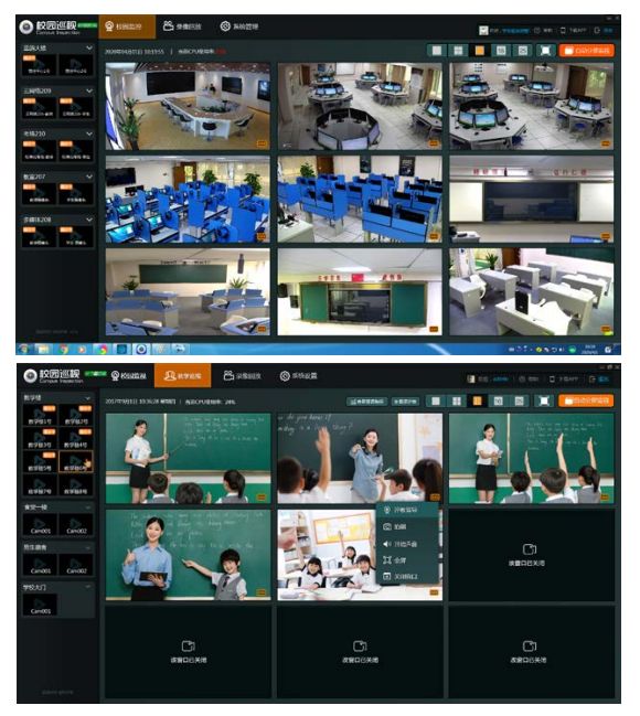 在教育局端上,主要建立了一套大数据、可视化的教学应用集成展示系统。通过调用学校端的数据,能够实现在线巡课,智能管控教学设备等。