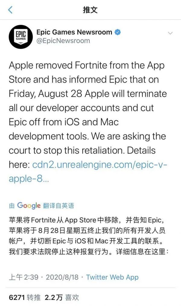 苹果、Google 这边准备应对诉讼的同时也没闲着,据 Epic 的推特内容,苹果已经通知它,将在 8 月 25 日停用 Epic 在 iOS 和 Mac 端的开发者账号,这意味着 Epic 之后可能没法在这两个平台开发应用了。
