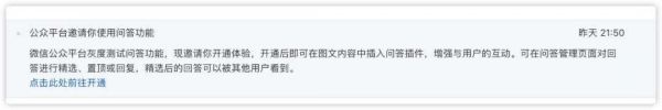 1. 开通问答功能后,用户可通过问答功能回答公众号提出的问题。
