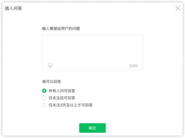开通这一功能后,便可以在图文消息的工作栏中找到“问答”功能组件,运营者能在文章中的任意位置插入自己的问题。