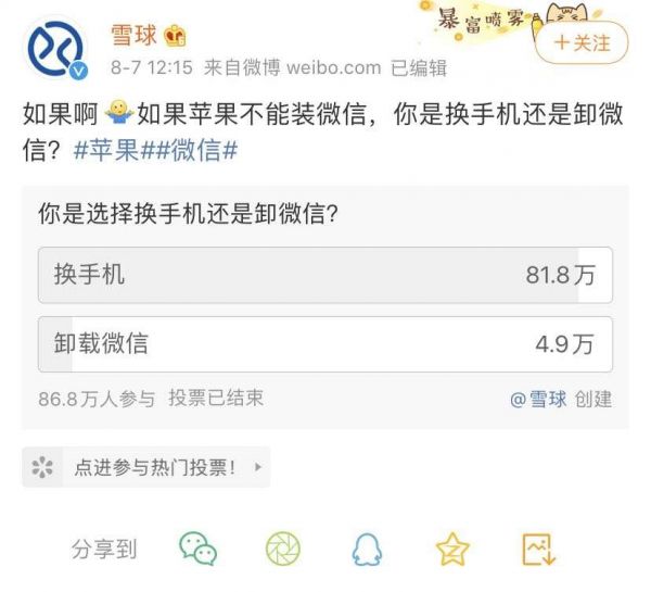 我们现在还不确定 iPhone 是否真的要将微信从应用商店下架。8 月 7 日,投资社区雪球在微博上发起投票:“如果苹果不能装微信,你是换手机还是卸微信?”截至 8 月 14 日,有 86.8 万人参与了投票,其中选择“换手机”的有 81.8 万,占到参与总人数的 94%。