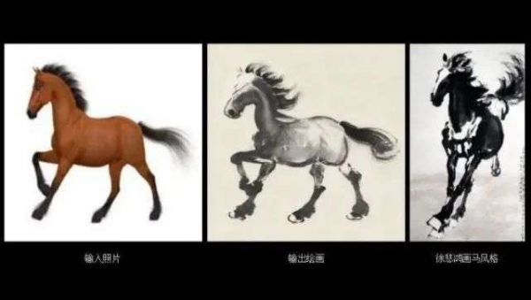 「道子智能绘画系统」通过机器学习技术在学习数百张徐悲鸿画的马和真实马的照片后,任意输入一张马的照片,就可以输出一张水墨画版的马。