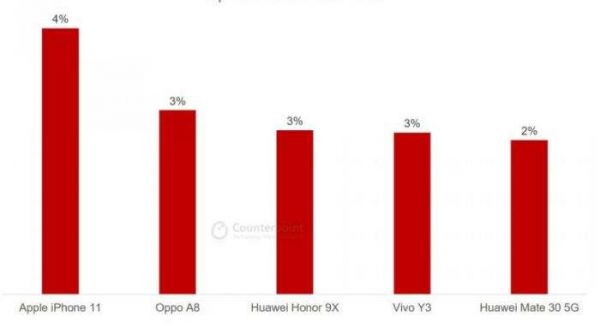 市场调研机构Counterpoint Research公布了8个国家第二季度前五名智能手机的销售榜单。报告显示,在中国Q2销量占前五的手机分别是:iPhone 11、OPPO A8、荣耀9X、VIVO Y3和华为Mate 30 5G。