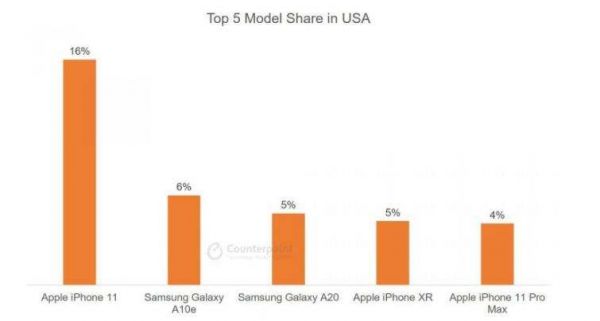 其次,值得注意的是,份额前五的旗舰手机只有iPhone 11和华为Mate 30 5G,而且都是发布时间超过半年的机型。虽然前三个季度各大安卓厂商都量产了65W或者125W以上的快充,由此也引发了苹果电池续航、充电速度弱的讨论。不过也不影响用户一边吐槽一边买iPhone,品牌力还是很充足。