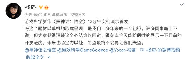 游戏出品方游戏科学Game Science联合创始人@-杨奇- 在微博表示,今天发布的视频只是“阶段性的展示一下目前的开发进度,未来也必全力以赴,希望最终不会再让你们失望。”