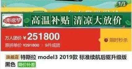 7月20日,拼多多平台的宜买车旗舰店推出了一个特斯拉model 3的万人团活动,原价291800的Model3,参与万人团活动可以获得两万的补贴,再加上2万的国家新能源车补,最终价格只需要251800元。